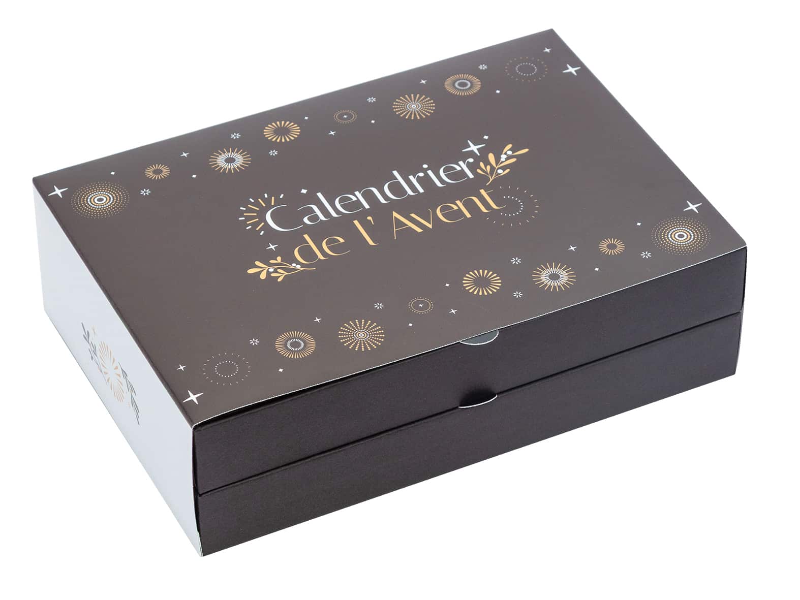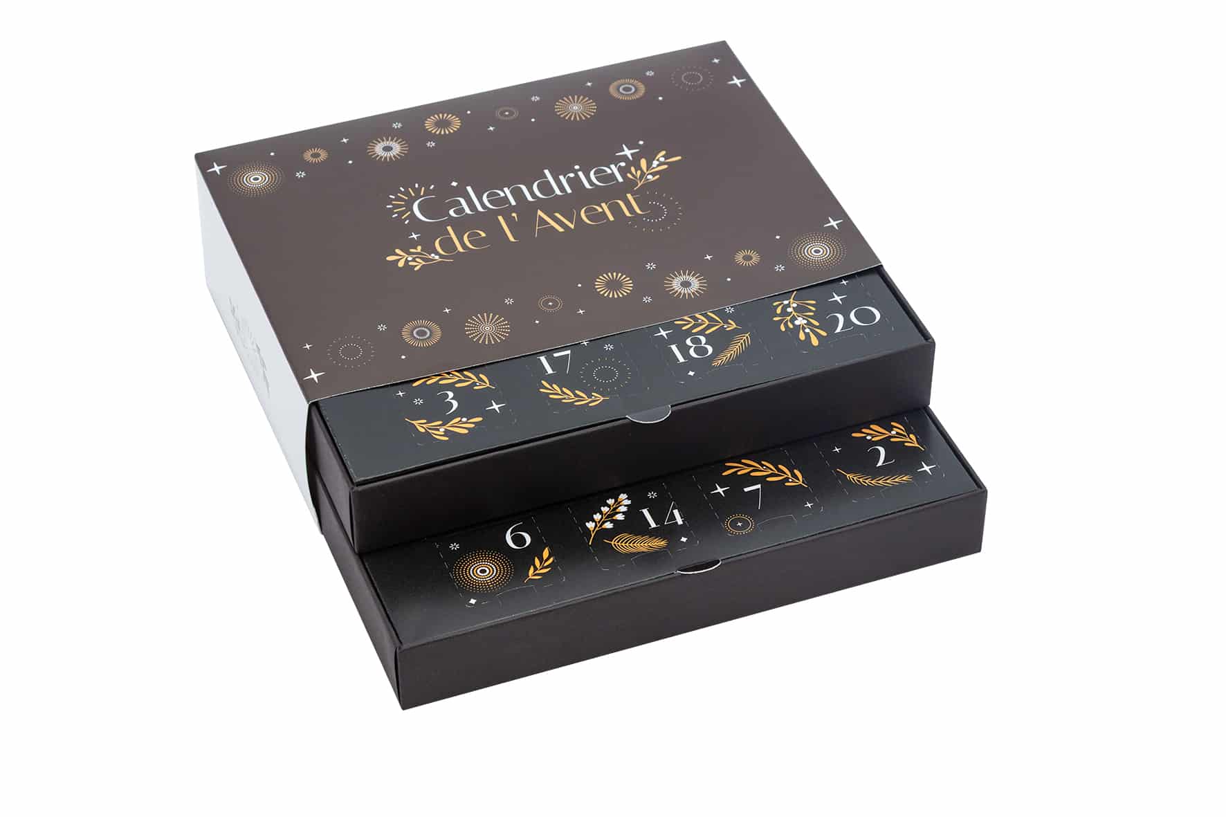 Et le 24 décembre, la magie opère : un grand carré de chocolat de 20 g, gravé au prénom de votre choix, vient clore le compte à rebours avec une touche à la fois gourmande et personnelle. Cette case est disponible en chocolat noir ou au lait, selon vos préférences.