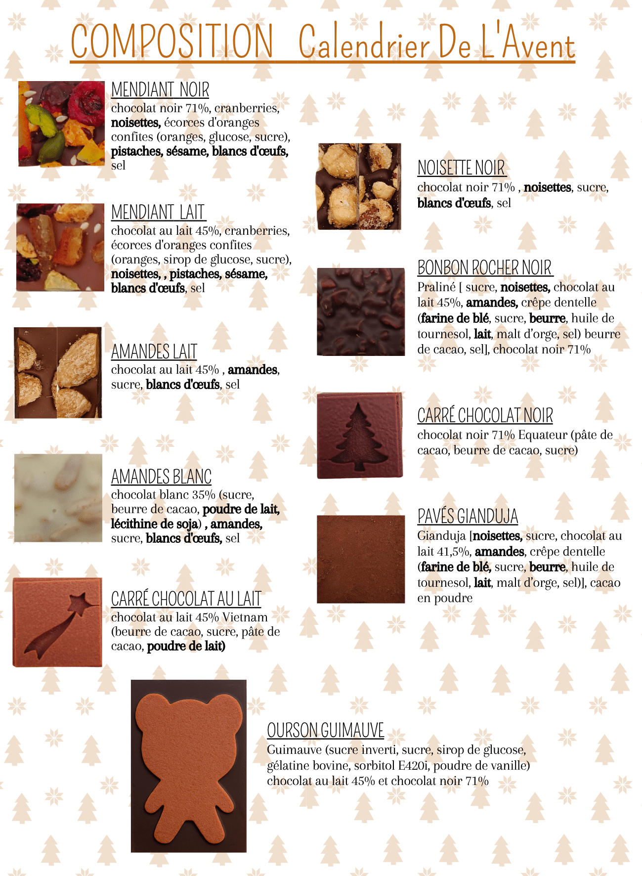 Composition du Calendrier : (Un flyer explicatif sera glissé dans votre colis avec les ingrédients de chaque bonbon.)