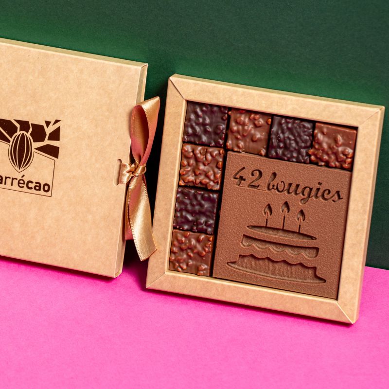 Le moment tant attendu de célébrer un anniversaire approche à grands pas et vous recherchez le cadeau parfait qui fera briller les yeux de la personne chère à votre cœur. Ne cherchez pas plus loin ! Notre coffret de chocolat personnalisé est l’ultime attention sucrée qui fera fondre le cœur de l’heureux destinataire. Nos coffrets de chocolat personnalisés sont composés d’une tablette de 8cm en chocolat noir ou chocolat au lait personnalisable avec le prénom ou le surnom de votre choix. Autour de cette tablette, vous trouverez 7 ou 16 bonbons, qui sont garnis de notre incontournable praliné maison croustillant et enrobés de chocolat noir 71% et chocolat au lait 45%. Découvrez nos différents visuels sur le thème d’un anniversaire pour trouver celui qui correspondra le mieux au destinataire. Comme notre Tablette de chocolat Anniversaire avec son gâteau et ses bougies !